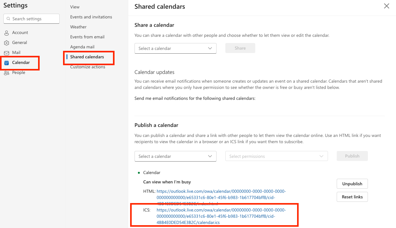 - Click Publish, then copy the provided ICS link to your clipboard.