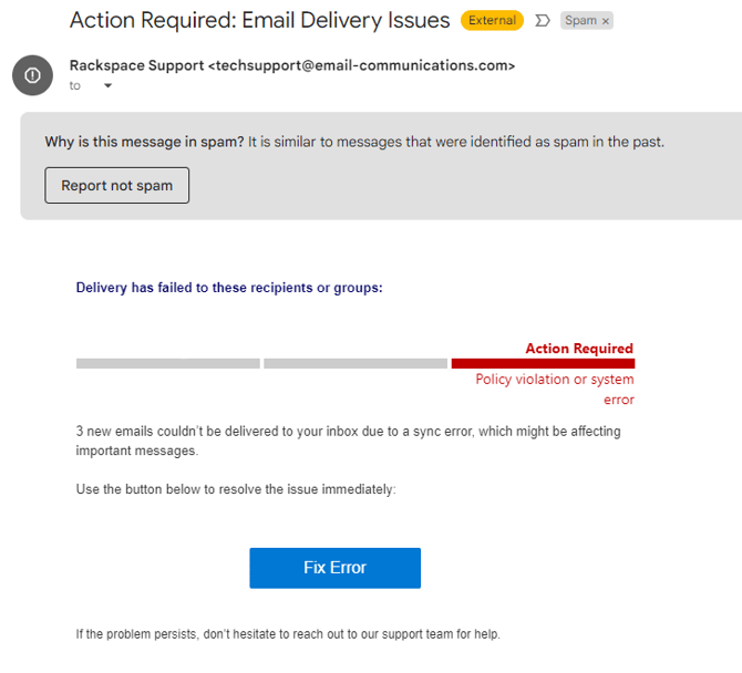 - Don't trust the 'name' of the email, you can set the names to whatever you want. Look at the sender's email domain, sometimes they will look close to the real thing and sometimes they will be completely different than expected, as seen below (email pretends to be from Rackspace but their domain email is generic and that domain isn't functioning). Companies that would send legitimate emails have all of that set up properly, unlike phishing emails.