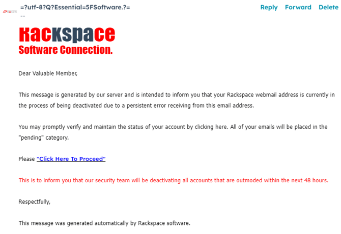 For clients who have email through our company, you may get scam messages pretending to look like Rackspace customer service. Please note that these emails are NOT legitimate emails sent by Rackspace. Rackspace will never initiate communications with you, they would strictly speak to us as the email provider.